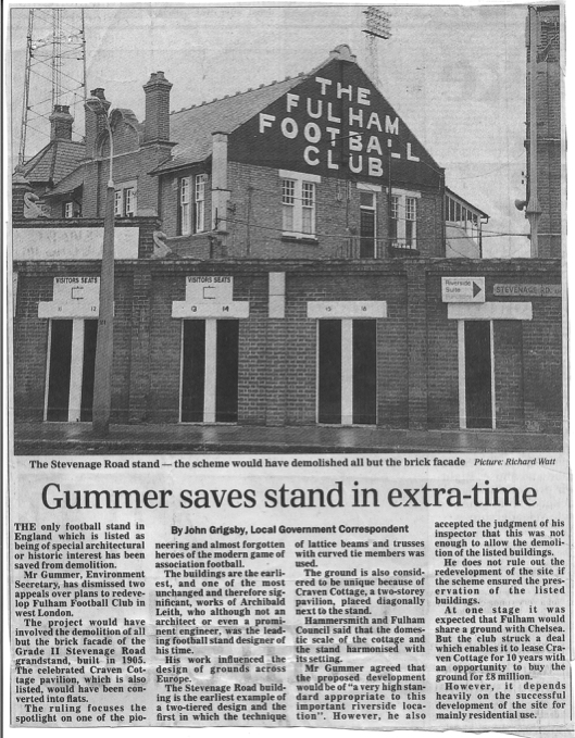 The club argued that they couldn't take the risk of losing the CPO and so took the property developers' money – by now Marler had sold out to Cabra Estates – which included an upfront payment of £2m for withdrawing their support for the CPO. A further £3.5m would follow when the club vacated Craven Cottage while the remaining hand-outs were subject to various conditions being met. The deal also saw the lease, due to expire on May 31, 1990 extended for a further three years.